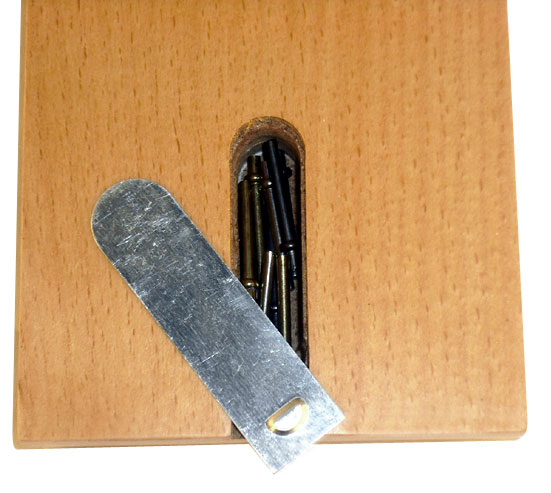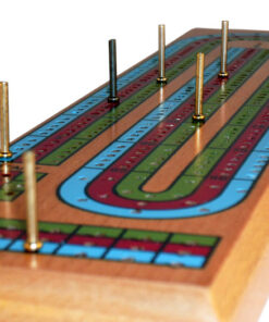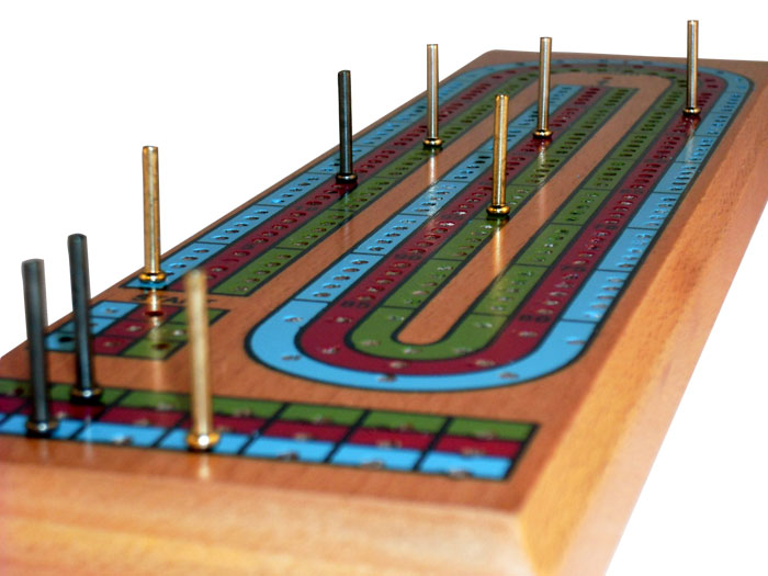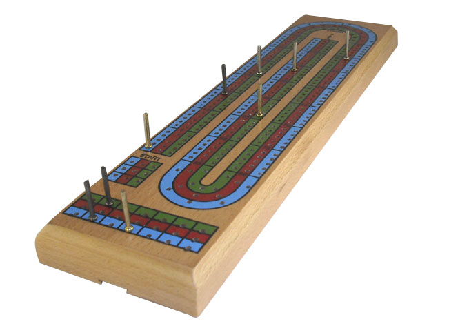 3 track cribbage. Storage compartment on underside of board to store pins.