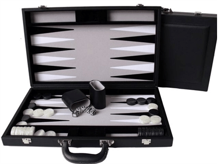 Black Dal Rossi 15″ backgammon set. Synthetic leather attache case, padded top. Inside grey felt with black and white inlaid playing fields (no stitching). Black & white mother of pearl look counters.