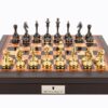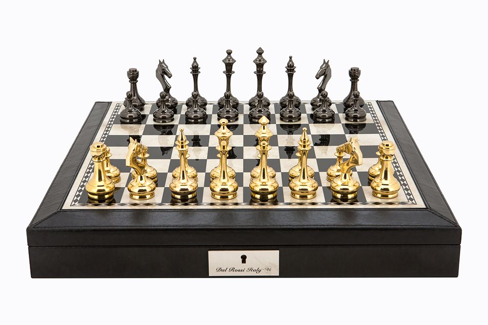 Staunton Brass/Titanium Cap Chess Set On PU leather black bevelled edge Chess Box 18″ with compartments