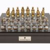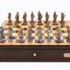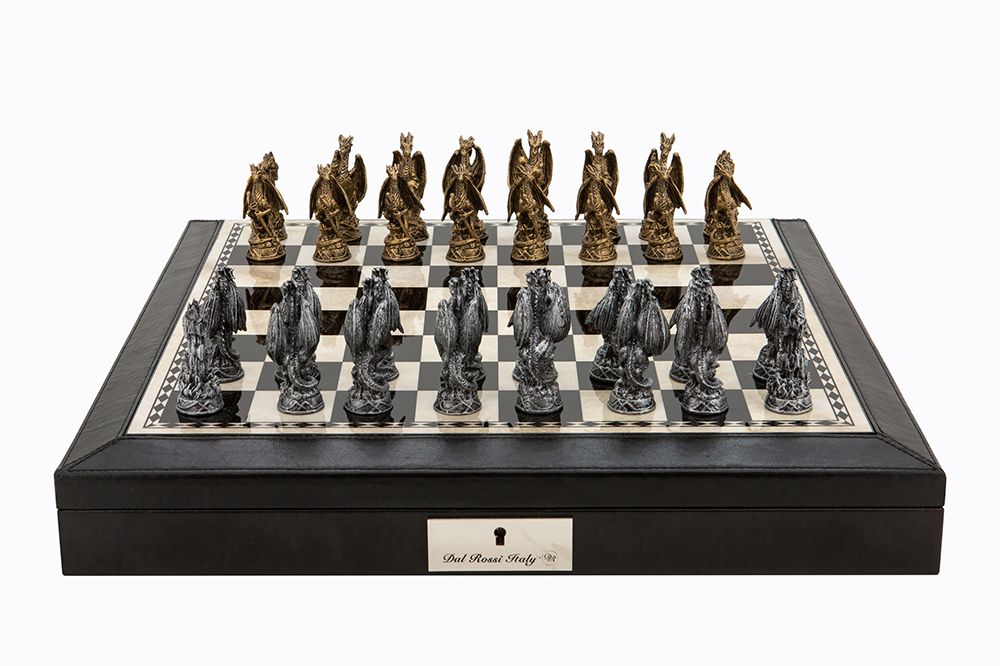 Dal Rossi Italy Brown PU Leather Bevelled Edge chess box with compartments 18″ with Dragon Pewter Chessmen