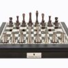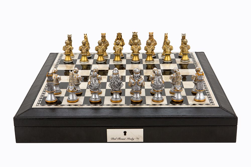 Dal Rossi Italy Brown PU Leather Bevelled Edge chess box with compartments 18″ with Medieval Warriors Resin Chessmen