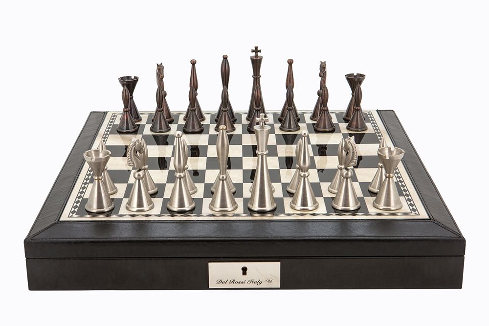 Dal Rossi Italy Brown PU Leather Bevelled Edge chess box with compartments 18″ with Staunton Metal Chessmen