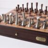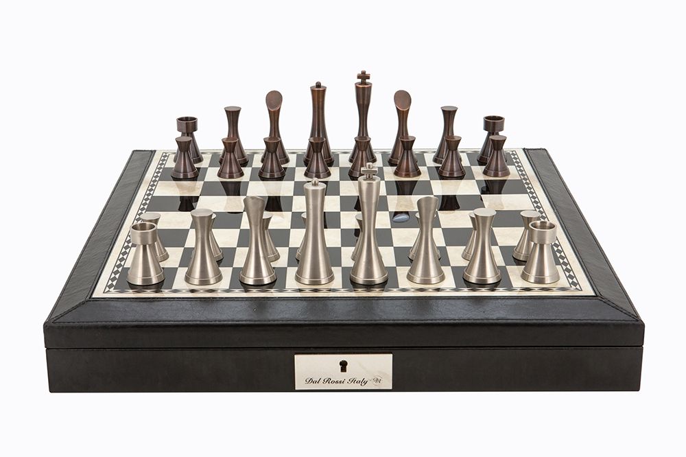 Dal Rossi Italy Brown PU Leather Bevelled Edge chess box with compartments 18″ with Contemporary Metal Chessmen