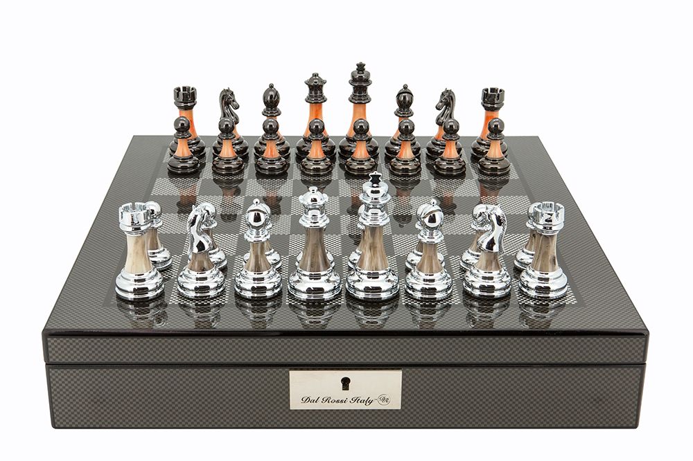 Dal Rossi Italy Carbon Fibre Shiny Finish Chess Box 16? with Metal Marble Chess Pieces