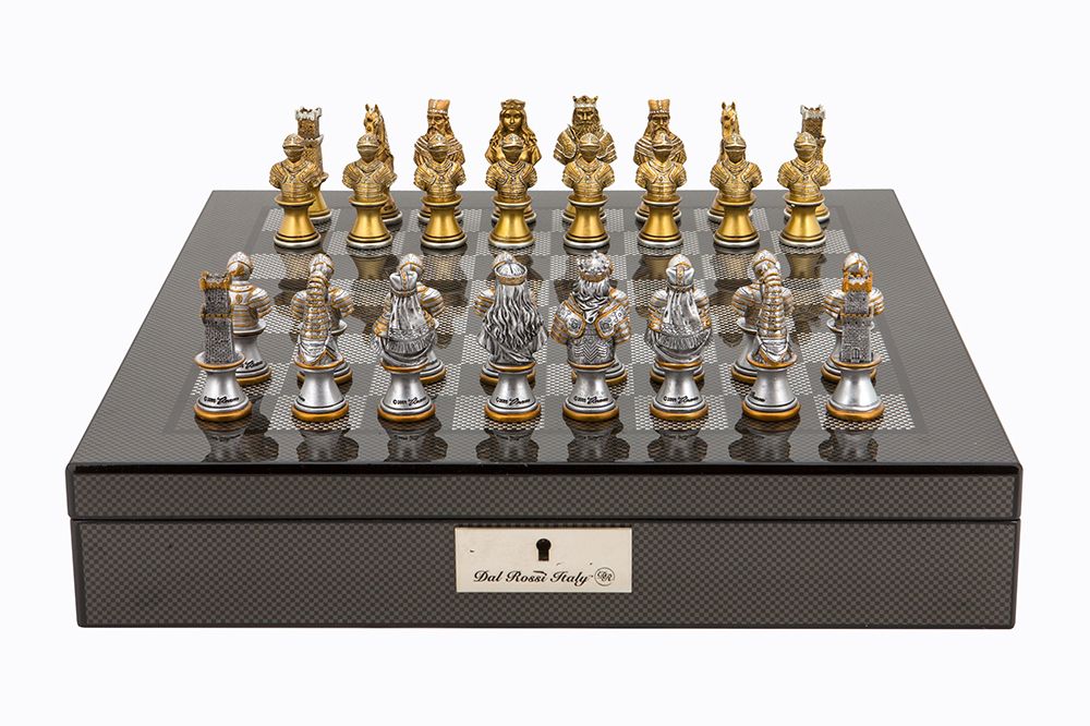 Dal Rossi Italy Carbon Fibre Shiny Finish chess box with compartments 16” with Medieval Warriors Resin Chessmen