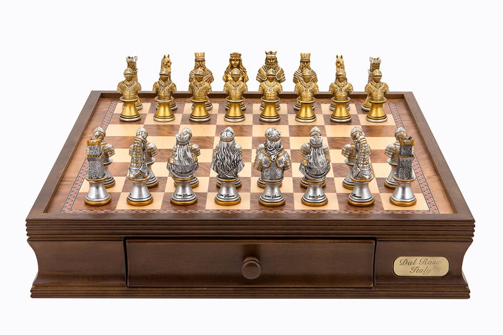 Dal Rossi Italy chess box with drawers 16” With Medieval Warriors Resin Chessmen