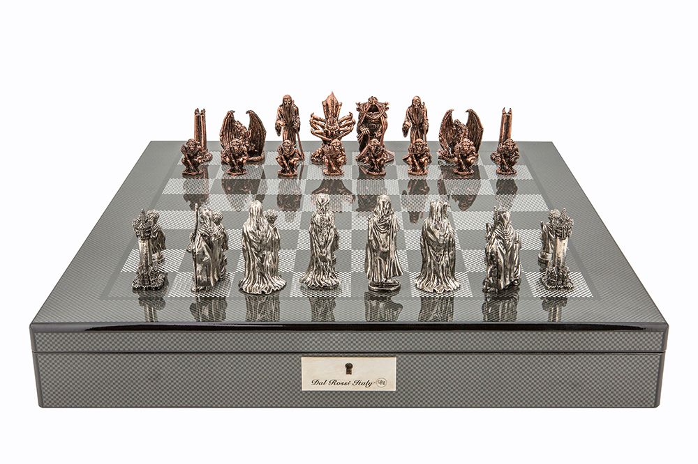 Dal Rossi Italy Evil Ring Metal Chess Set on Carbon Fibre Shiny Finish Chess Box 20” with compartments