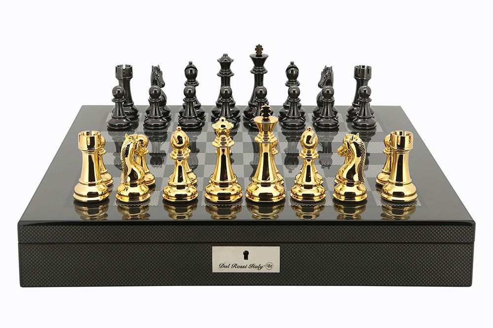 Gold/Titanium Finish Chess Set On carbon fibre finish Chess Box 20″ with compartments