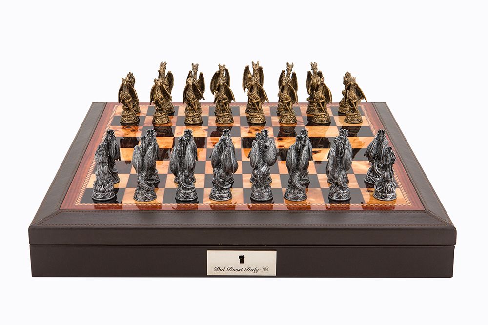Dragons Pewter Chess Set on PU leather brown bevelled edge Chess Box 18″ with compartments